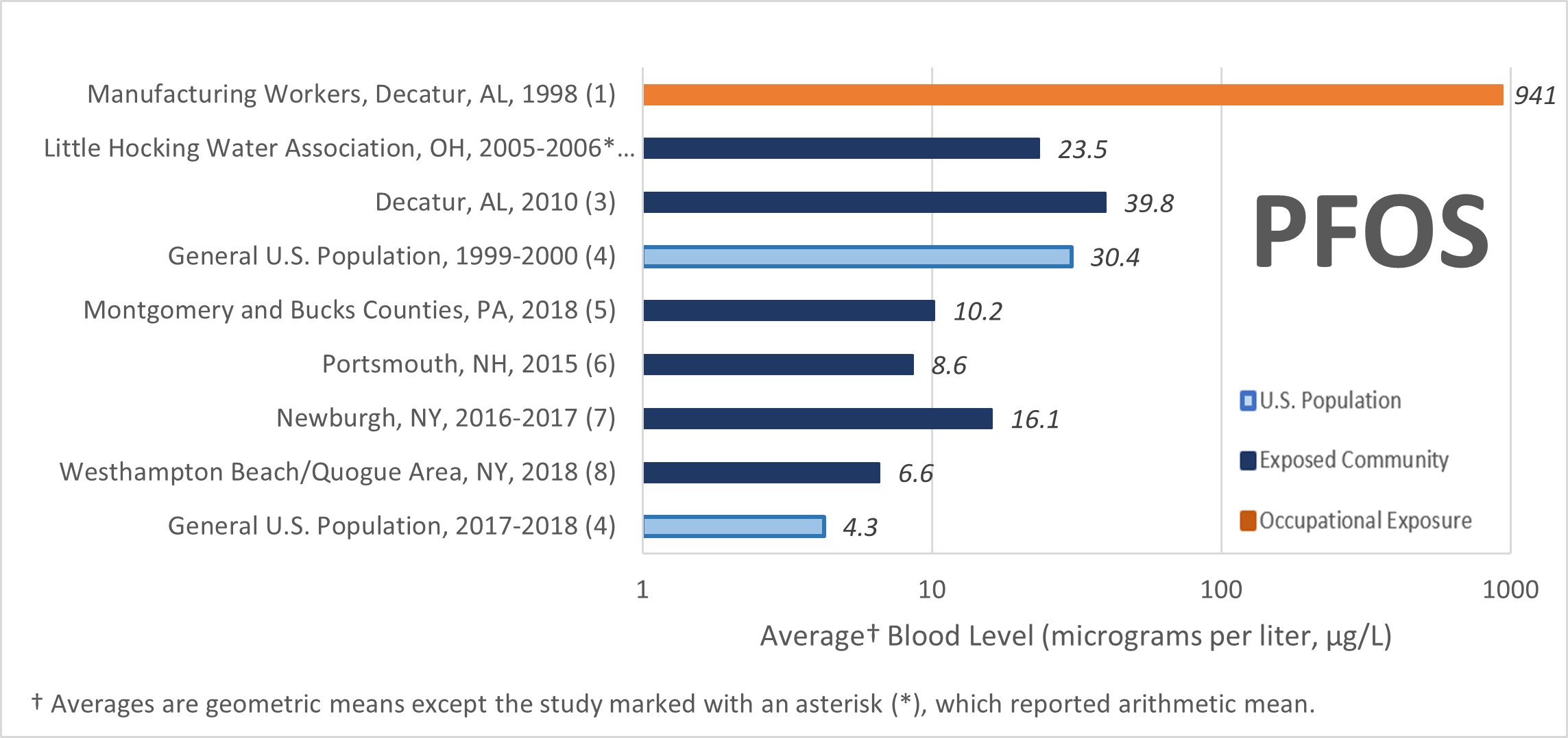 The figures below show PFOA, PFOS, and PFHxS blood levels measured in different exposed populations. These are compared to levels CDC measured in the general U.S. population in 1999-2000, 2015-2016, and 2017-2018.