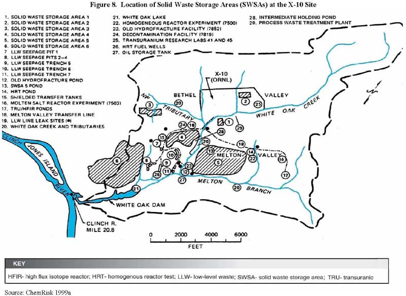 White Oak Creek travels south along the X-10 border, flows through or past several contaminated sources in Melton Valley (e.g., solid waste storage areas), and ultimately empties into White Oak Lake. The government had anticipated using this man-made lake as a "settling basin" for radionuclides released from the X-10 site. Some of the contaminants, however, did not settle in White Oak Lake. Instead, they flowed over White Oak Dam into the White Oak Creek Embayment, and then entered the Clinch River. As contaminants in White Oak Creek surface water enter the Clinch River, their concentrations will dilute; and when the Clinch River meets the Tennessee River, the concentrations will dilute even further. The ORR-related surface water and sediment that traveled through the Clinch River eventually flowed into the LWBR. The LWBR, which is located downstream of the ORR, extends from the confluence of the Clinch River and the Tennessee River to the Watts Bar Dam. Between 1944 and 1991, approximately 200,000 curies of radioactive waste were discharged from X-10 into the Clinch River via White Oak Creek.
