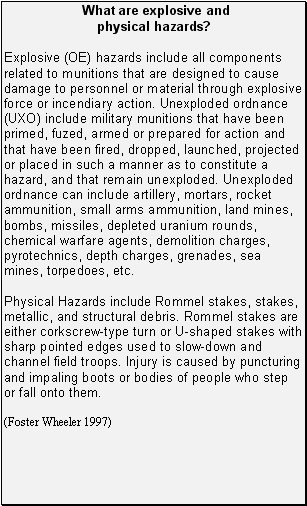 To reduce the potential hazards of contact with land mines, other unexploded ordnance, and Rommel stakes in several areas away from downtown, Navy contractors have investigated and removed all known items which pose explosive or other physical hazards. The Intrusive Sampling Study and Minefield Investigation Study for the 1998 Field Season included unexploded ordnance investigations. In the summer of 1999, the Navy conducted additional investigations as reported in the Site Investigation Study. Rommel stakes have been removed along the most popular hiking trails. During the summer of 2000, the Navy removed Rommel stakes from all known areas.