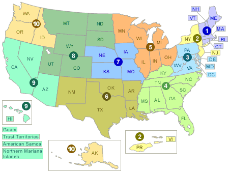 Figure 1.1 – Mapa de las oficinas regionales de la Agencia de Protección del Medio Ambiente de EE. UU. (EPA, por sus siglas en inglés)