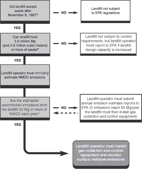 In 1996, EPA promulgated regulations under the CAA—NSPS/EG—that also address emissions from MSW landfills. These regulations apply to MSW landfills that accepted waste after November 8, 1987. The NSPS/EG require landfills that can hold 2.5 million megagrams (Mg) or more of waste and annually emit 50 Mg or more of NMOCs to install landfill gas collection systems and control landfill gas emissions. The collection systems must meet specific engineering design criteria. Control devices (usually a flare or some other combustion device) must reduce the NMOC emissions from the collected landfill gas by 98% or to a concentration of 20 ppm by volume. Those MSW landfills that are required to install controls based on their NMOC emission rate must also moni-tor surface methane emissions. If methane emissions are found at concentrations exceeding background levels by more than 500 parts per million (ppm) between 2 and 4 inches from the ground surface, the gas collection system must be adjusted or improved to achieve the 500 ppm level. The NSPS/EG also contain various other testing, monitoring, and reporting requirements that landfills must meet. Figure 2-2 can help determine to what extent, if any, the MSW landfill(s) in the area must comply with the requirements of the NSPS/EG. The NSPS/EG can be found in the Code of Federal Regulations (CFR), at 40 CFR Part 60, Subparts Cc and WWW. Additional information can be found at http://www.epa.gov/ttn/uatw/landfill/landflpg.html.